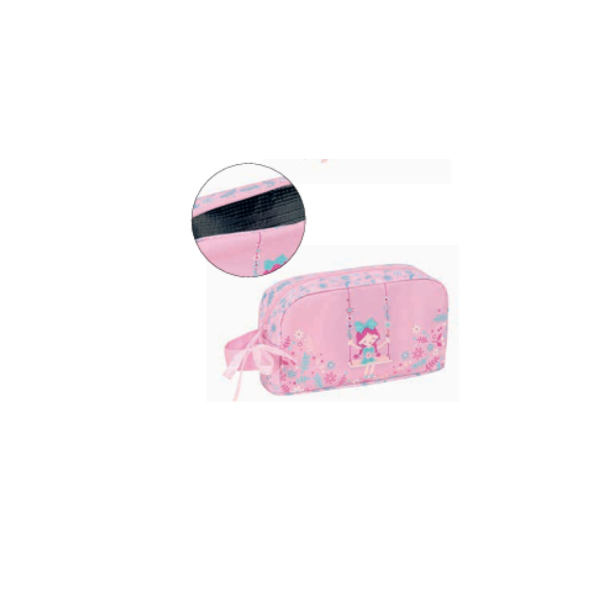 Com fundo rosa, traz a ilustração de uma menina no baloiço, flores bordadas e detalhes especiais que fazem toda a diferença.