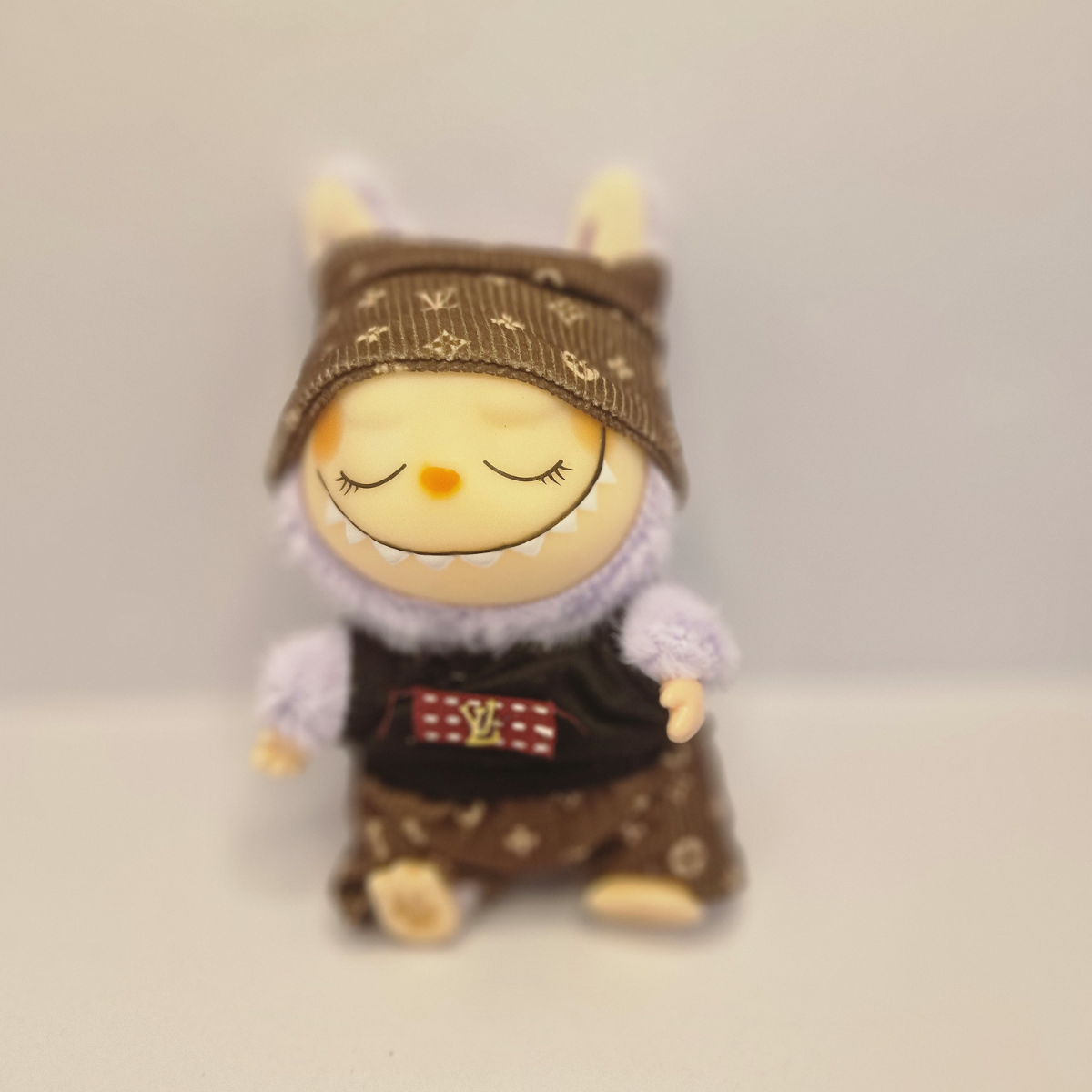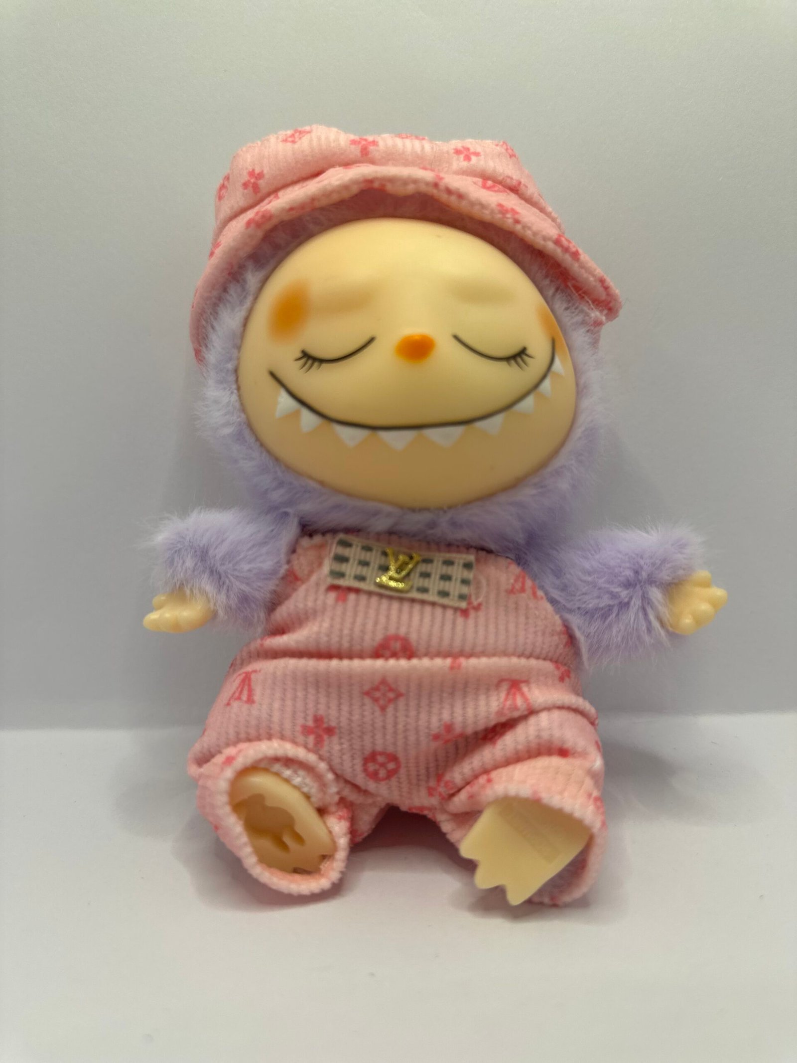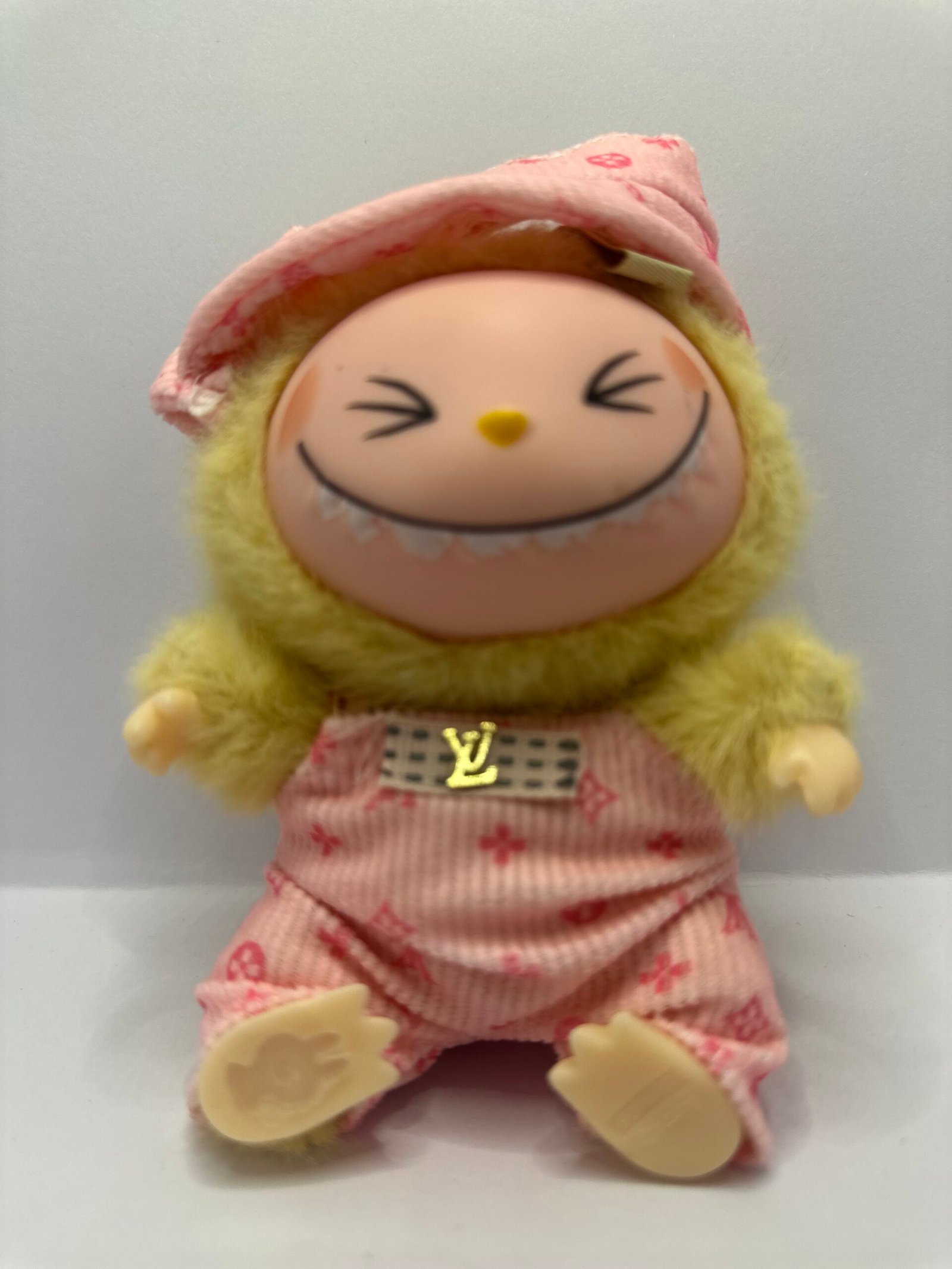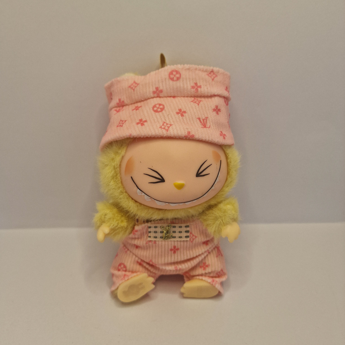 Labubu “Fashion LV Collection” reúne seis figuras de 12 cm com macacão monograma e gorro coordenado. Tens três designs em rosa pastel e três em castanho vintage, cada qual com expressão diferente.