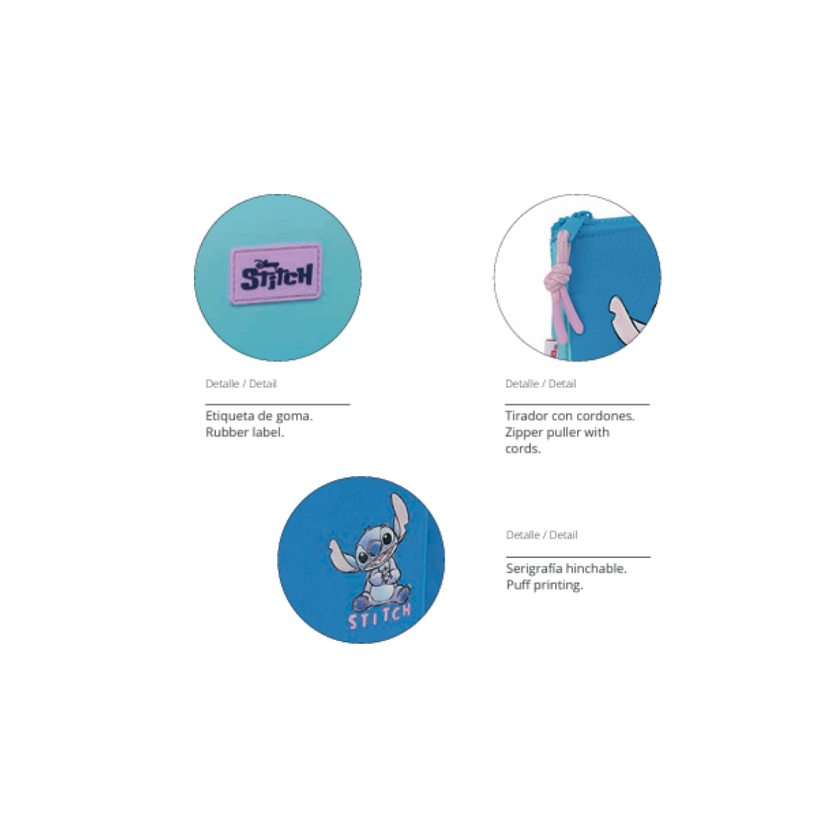 Na cor azul vibrante, traz estampa divertida do Stitch em serigrafia puff (efeito em relevo), além de etiqueta em borracha com a marca e puxadores em cordão.