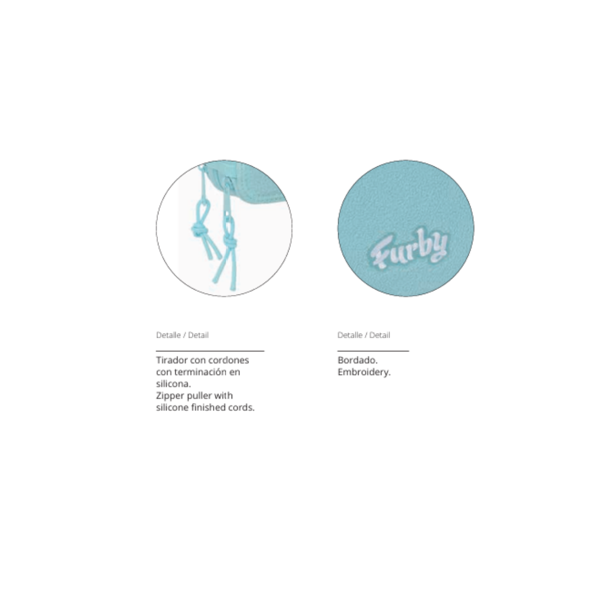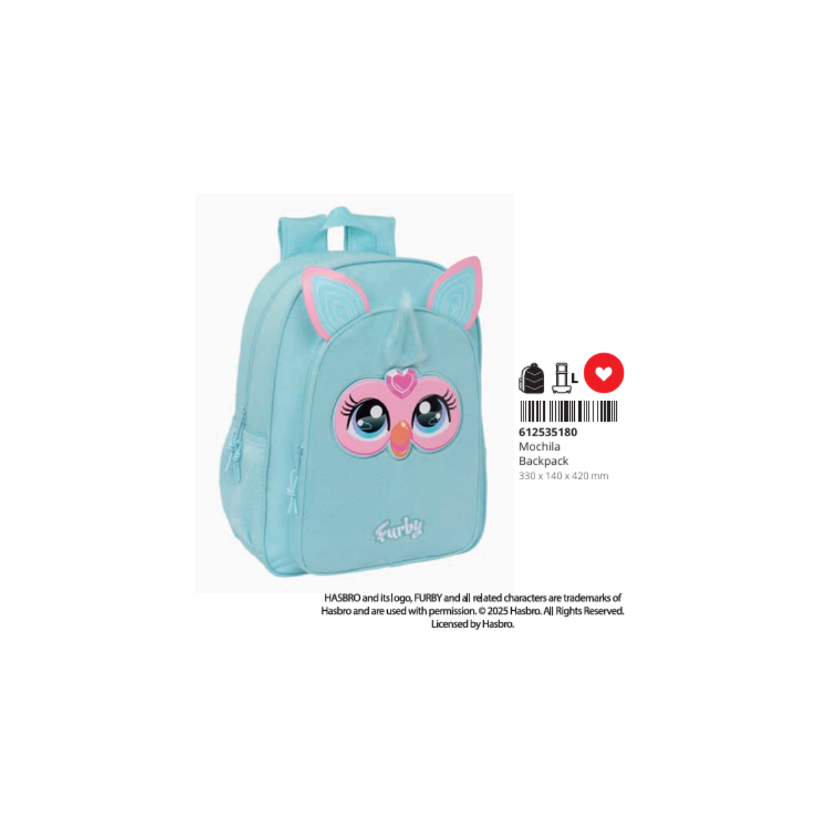 Com design em azul claro e detalhes inspirados no Furby, esta mochila é ao mesmo tempo prática e lúdica.
